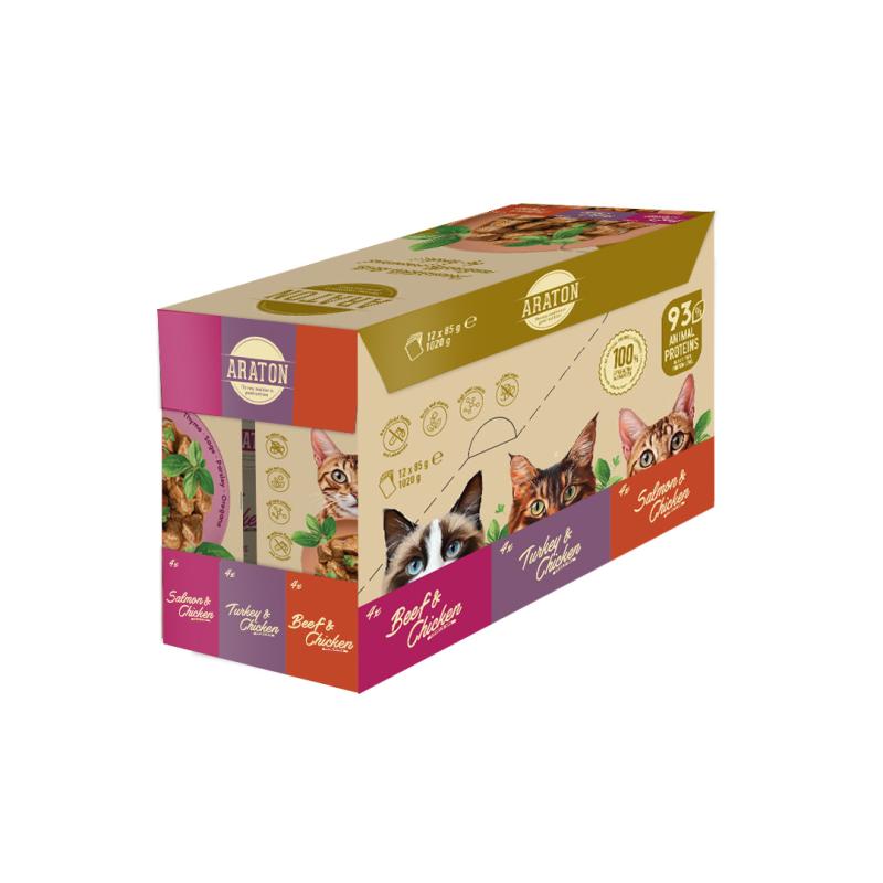 ARATON visavertis šlapias pašaras su kalakutiena ir vištiena, su jautiena ir vištiena bei su lašiša ir vištiena – tai trijų skirtingų receptų rinkinys, sukurtas kasdieniam šėrimui, kai svarbi ir skonio įvairovė, ir subalansuota mityba. Katės – išrankūs gyvūnai, kurių poreikiai kinta su amžiumi, sezonais ar nuotaika. Šis rinkinys leidžia keisti skonį nekeičiant kokybės, užtikrinant, kad kiekvienas kąsnis būtų ir skanus, ir naudingas organizmui.