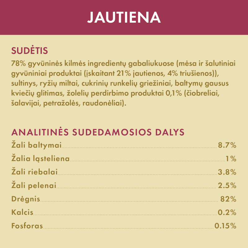 Visavertis šlapias pašaras su jautiena ir triušiena suaugusiems šunims. Švelnūs gabaliukai padaže su žolelėmis ir skaidulomis – virškinimui, energijai ir gerai savijautai kasdien.
