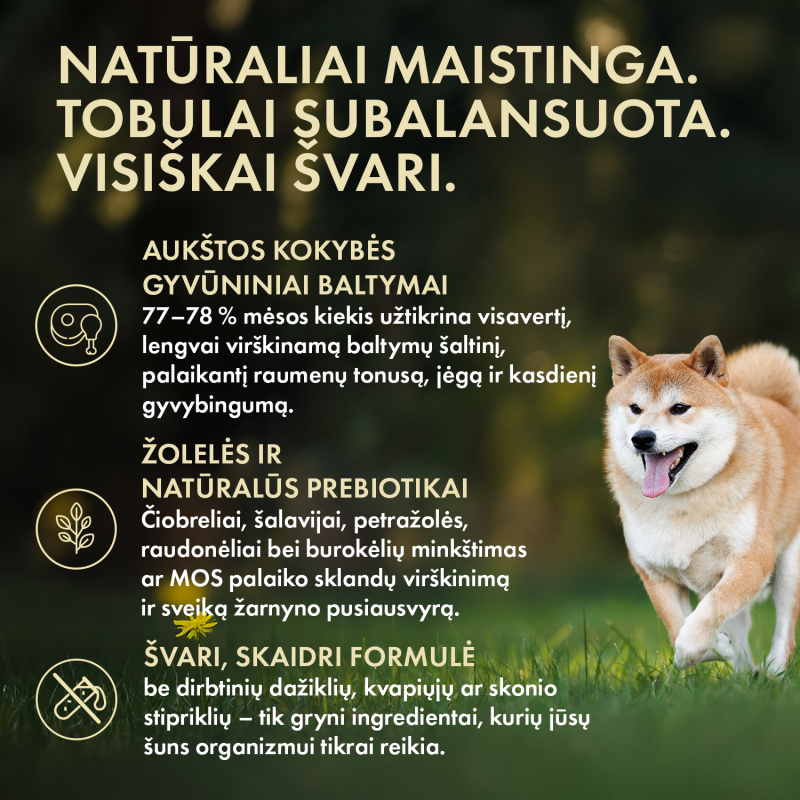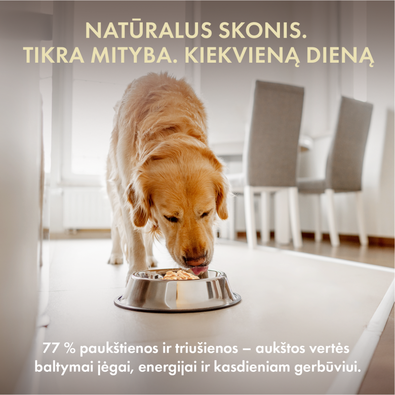 Be dirbtinių dažiklių ir kvapiklių – švarus pasirinkimas kiekvienai dienaiTik tai, ko reikia šuniui – be perteklinių priedų ar stipriklių.