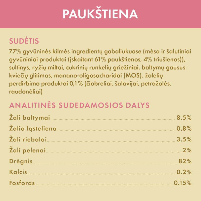 77 % gyvūninės kilmės ingredientų – sotumui, baltymams ir natūraliam skoniuiPaukštiena ir triušiena padeda palaikyti raumenų tonusą ir kasdienę energiją.