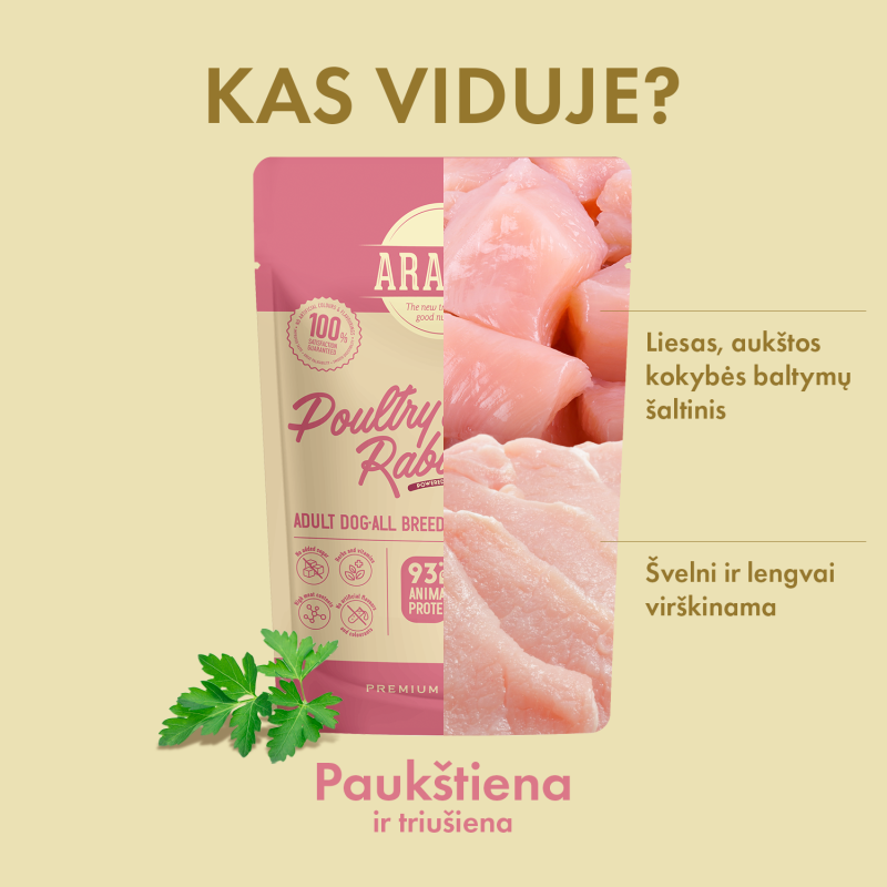ARATON visavertis šlapias maistas su paukštiena ir triušiena – subalansuotas pasirinkimas suaugusiam šuniui. Kai svarbu ne tik skonis, bet ir kasdienė gerovė, šis maistas tampa patikimu sprendimu. Skirtas visų veislių suaugusiems šunims, jis aprūpina svarbiausiomis maistinėmis medžiagomis, padeda palaikyti sveiką virškinimą, stiprų imunitetą ir gerą odos bei kailio būklę.