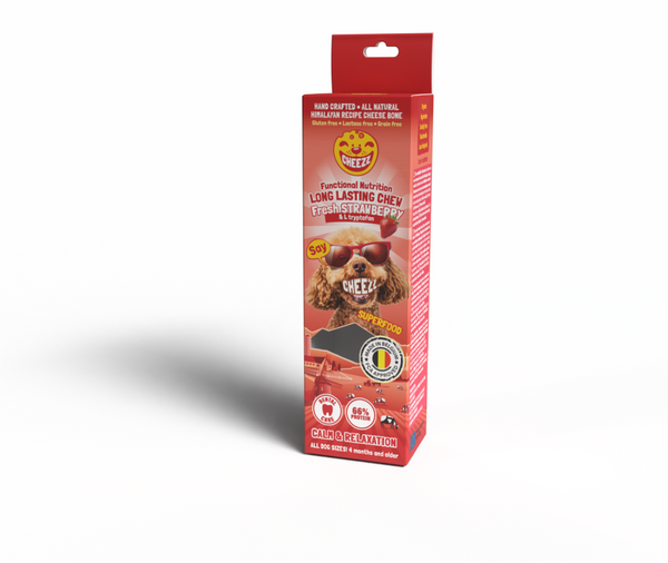 CHEEZZ „Calming“ sūrio skanėstai su braškėmis – tai funkcionalus, kruopščiai subalansuotas skanėstas, sukurtas šunims, kuriems reikia daugiau ramybės ir emocinės pusiausvyros. Sudėtyje esantis L-triptofanas padeda palaikyti natūralų serotonino išsiskyrimą, todėl skatina atsipalaidavimą ir gali padėti mažinti įtampą. Ramunėlės ir melisa garsėja raminamosiomis savybėmis, kurios teigiamai veikia šuns nuotaiką ir miego kokybę. Į skanėstų sudėtį įeinantys prebiotikai FOS palaiko sveiką virškinimą, o kalcio karbonatas padeda stiprinti kaulus ir dantis. Tai gardus, natūralus, su pienu ir tikra braškių tyre pagamintas skanėstas – idealus pasirinkimas kasdieniam palepinimui ar stresinėse situacijose.Gali padėti skatinti ramybę ir atsipalaidavimą.