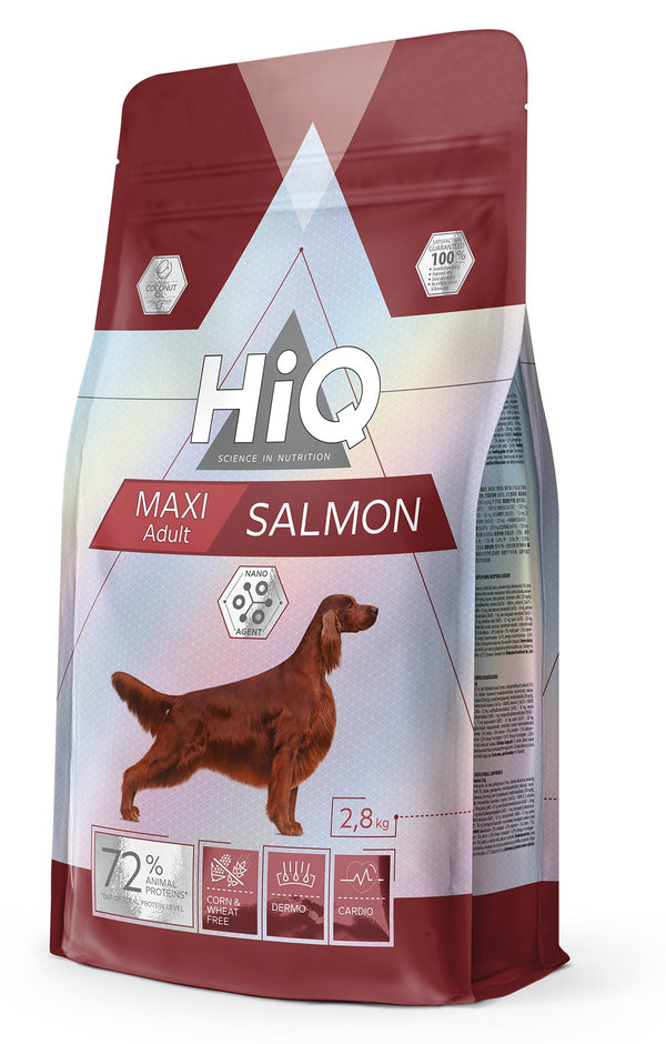 HIQ Maxi Adult Salmon – visavertis sausas pašaras didelių veislių suaugusiems šunims. Sudėtyje – 35 % lašišos, praturtintas MZG (NanoAgent), gliukozaminu ir chondroitinu sąnariams. Kokosų aliejus, linų sėmenys ir žuvų taukai padeda palaikyti sveiką odą, kailį ir imunitetą.