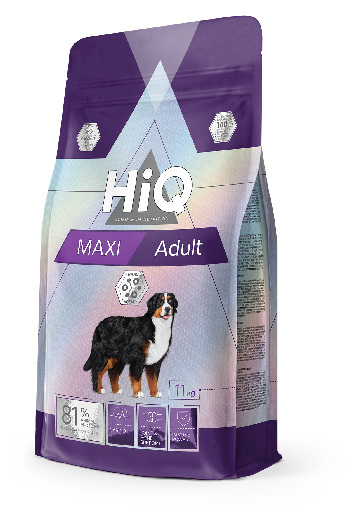 HIQ Maxi Adult – visavertis sausas pašaras sukurtas suaugusiems didelių veislių šunims (nuo 25 kg). Receptūroje naudojama net 39 % džiovintos paukštienos – tai puikus gyvūninių baltymų šaltinis raumenų masei ir energijai palaikyti.