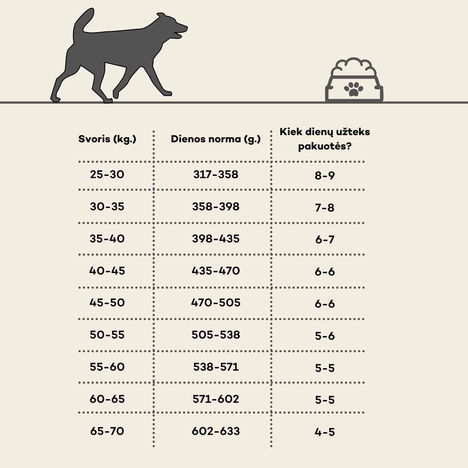 Į sudėtį taip pat įtraukti prebiotikai, gliukozaminas ir chondroitinas – sąnarių bei mikrofloros palaikymui, ypač svarbu didelių veislių šunims.
