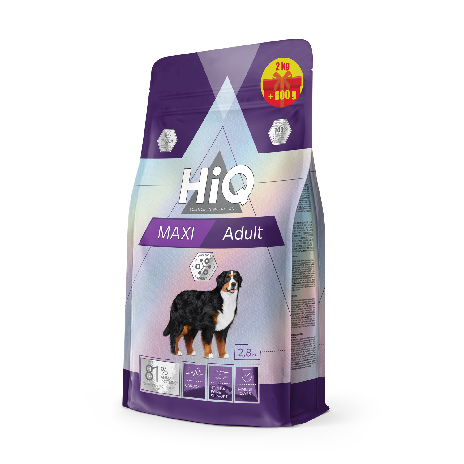 HIQ Maxi Adult – visavertis sausas pašaras sukurtas suaugusiems didelių veislių šunims (nuo 25 kg). Receptūroje naudojama net 39 % džiovintos paukštienos – tai puikus gyvūninių baltymų šaltinis raumenų masei ir energijai palaikyti.