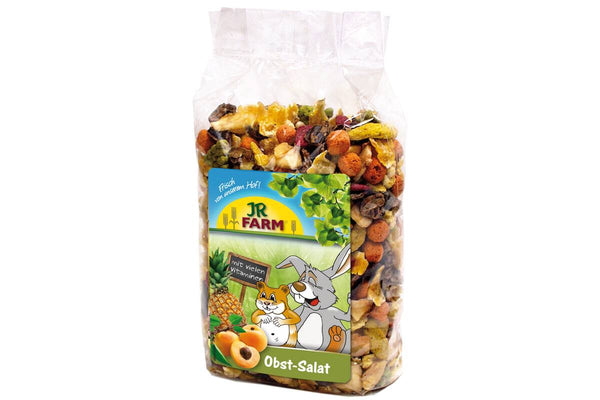 "JR Farm Fruit-Salad" - tai aukštos kokybės pašaro papildas, išskirtinis mišinys, kurį sudaro įvairios džiovintos daržovės ir vaisiai iš viso pasaulio. šis pašaro papildas specialiai sukurtas nykštukiniams triušiams, jūrų kiaulytėms, žiurkėnams, žiurkėms ir pelėms, tad atitinka visus šių graužikų mitybos poreikius. Pagardinkite savo augintinio pašarą šiuo natūraliu, išskirtiniu pašaro papildu.