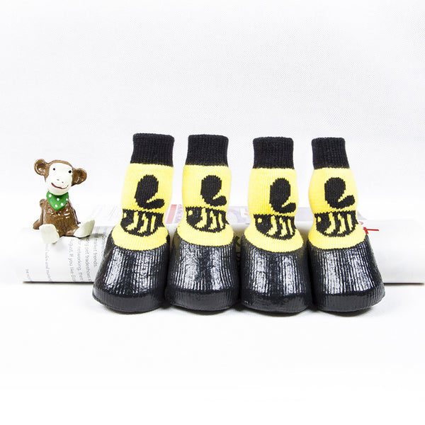 Žaismingo dizaino guma dengtos kojinės skirtos šunims dėvėti lauke.