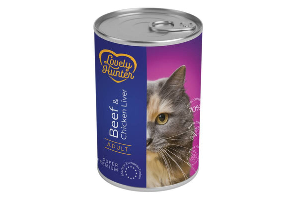 "Lovely Hunter Beef & Chicken Liver" - visavertis konservuotas pašaras su jautiena ir vištų kepenėlėmis, skirtas suaugusioms katėms.