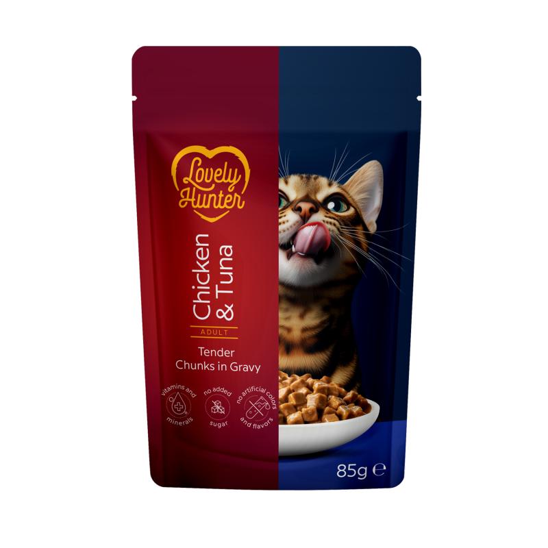 Lovely Hunter Visų veislių suaugusių kačių šlapias pašaras su vištiena ir tunu