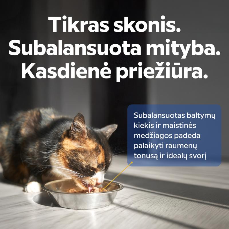 NATŪRALUMAS IR SAUGUMAS. Be pridėtinio cukraus, dirbtinių dažiklių ar skonio stipriklių – tik tai, ko reikia kasdieniam katės maitinimui. PagamintaLietuvoje, laikantis aukštų kokybės ir saugos standartų.