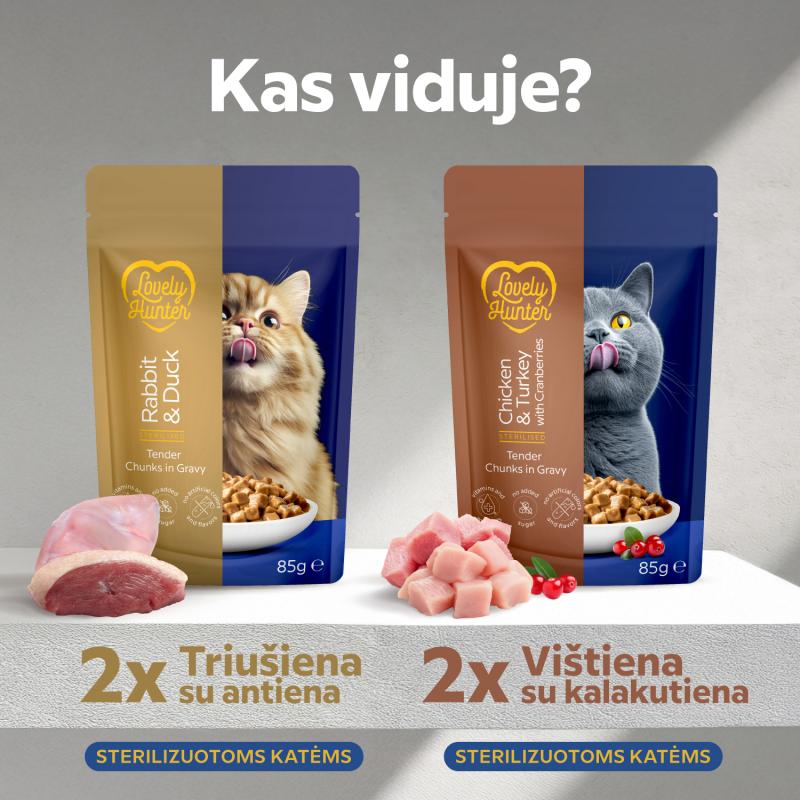 SKONIS, KURĮ RENKASI KATĖS. Sterilizuotų kačių mityba reikalauja ypatingo balanso – mažiau kalorijų, daugiau dėmesio šlapimo sistemai ir bendrai sveikatai. Lovely Hunter šlapias maistas sterilizuotoms katėms sukurtas specialiai taip, kad rūpintųsi sterilizuotų kačių gerove kiekvieną dieną.