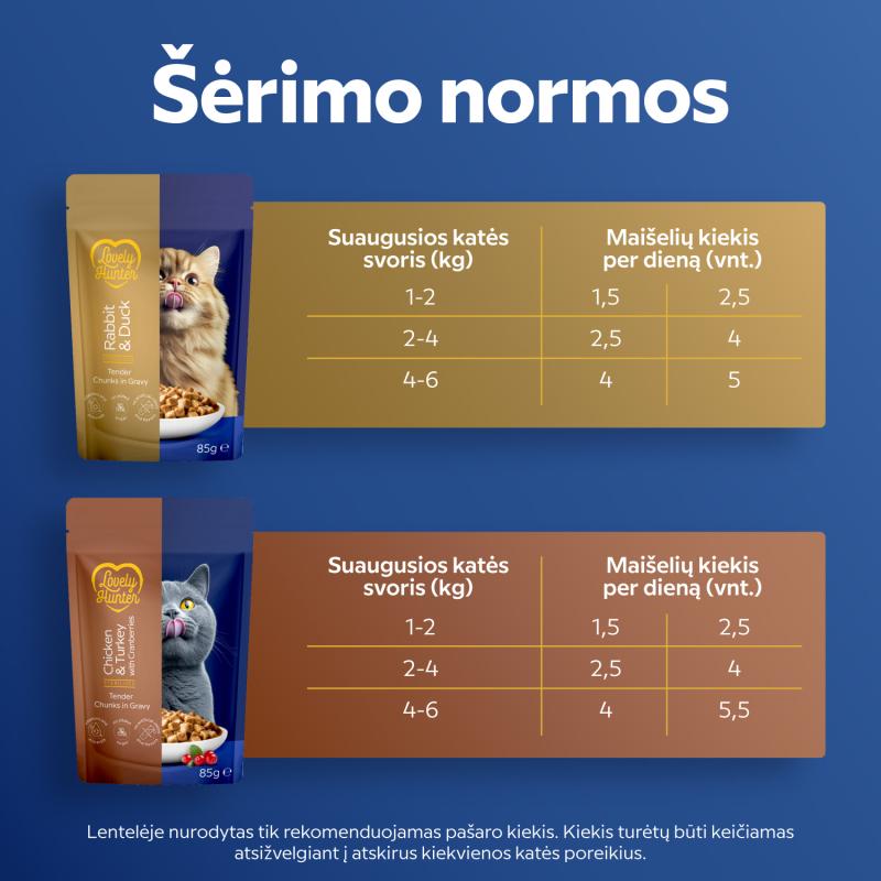 Lovely Hunter Sterilised Adult Cats All Breeds, suaugusių, sterilizuotų kačių šlapias pašaras su vištiena ir kalakutiena. Analitinės sudedamosios dalys: žali baltymai – 7,4 %, žali pluoštai – 0,7 %, žali riebalai – 3,1 %, žali pelenai – 1,4 %, drėgmė – 82 %, kalcis – 0,35 %, fosforas – 0,3 %, natris – 0,3 %.
