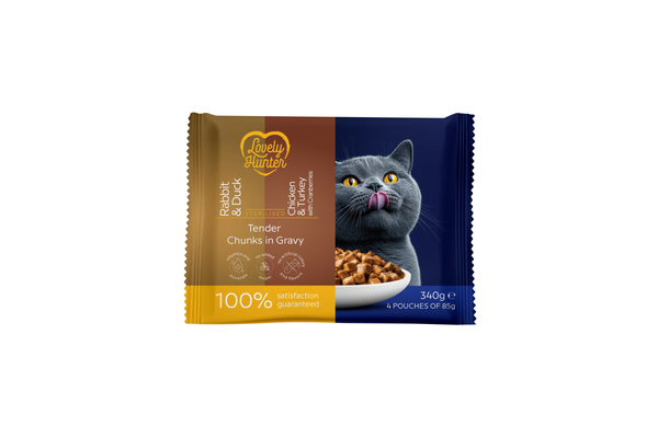Lovely Hunter Sterilised Adult Cats All Breeds, visų veislių suaugusių sterilizuotų kačių šlapias pašaras su triušiena ir antiena. Sudėtis: sausumos gyvūnų produktai ir iš jų gauti produktai (įskaitant 9 % triušienos, 8 % antienos), grūdai ir iš jų gauti produktai, gumbavaisiai, šakniavaisiai ir iš jų gauti produktai, kiti augalai, dumbliai, grybai ir iš jų gauti produktai, aliejiniai augalai, aliejiniai vaisiai ir iš jų gauti produktai, mineralai ir iš jų gauti produktai.