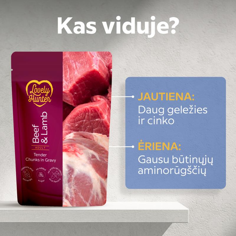 Lovely Hunter šlapias maistas šunims su jautiena ir ėriena– tai kasdienis sprendimas visų veislių suaugusiems šunims, užtikrinantis gerą skonį, reikalingas maistines medžiagas, kad augintinis jaustųsi gerai.
