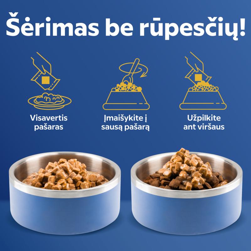GABALIUKAI SULTINGAME PADAŽE. Jautienos ir ėrienos derinys suteikia natūralų skonį bei gyvūninės kilmės baltymus, kurie reikalingi raumenų palaikymui, ištvermei ir energijai. Sultingas padažas užtikrina dar didesnį ėdamumą bei padeda palaikyti tinkamą skysčių kiekį organizme – tai ypač svarbu šunims, kurie mažiau geria vandens.