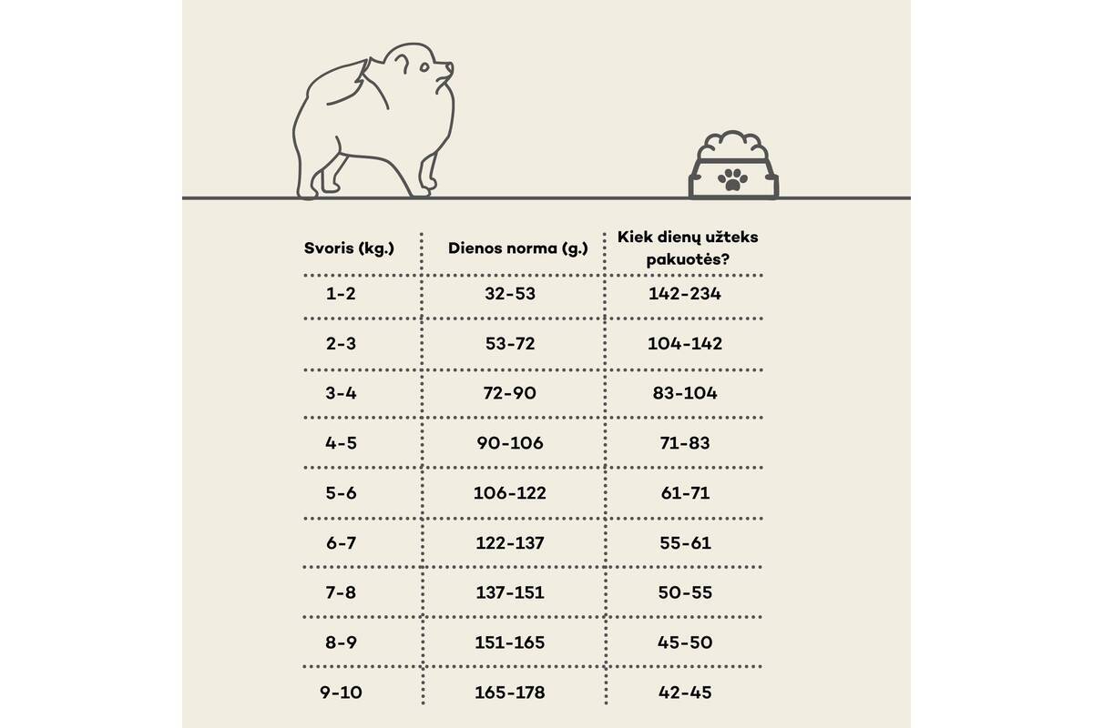 - Maža granulė – specialiai pritaikyta suaugusiems mažų veislių šunims.
