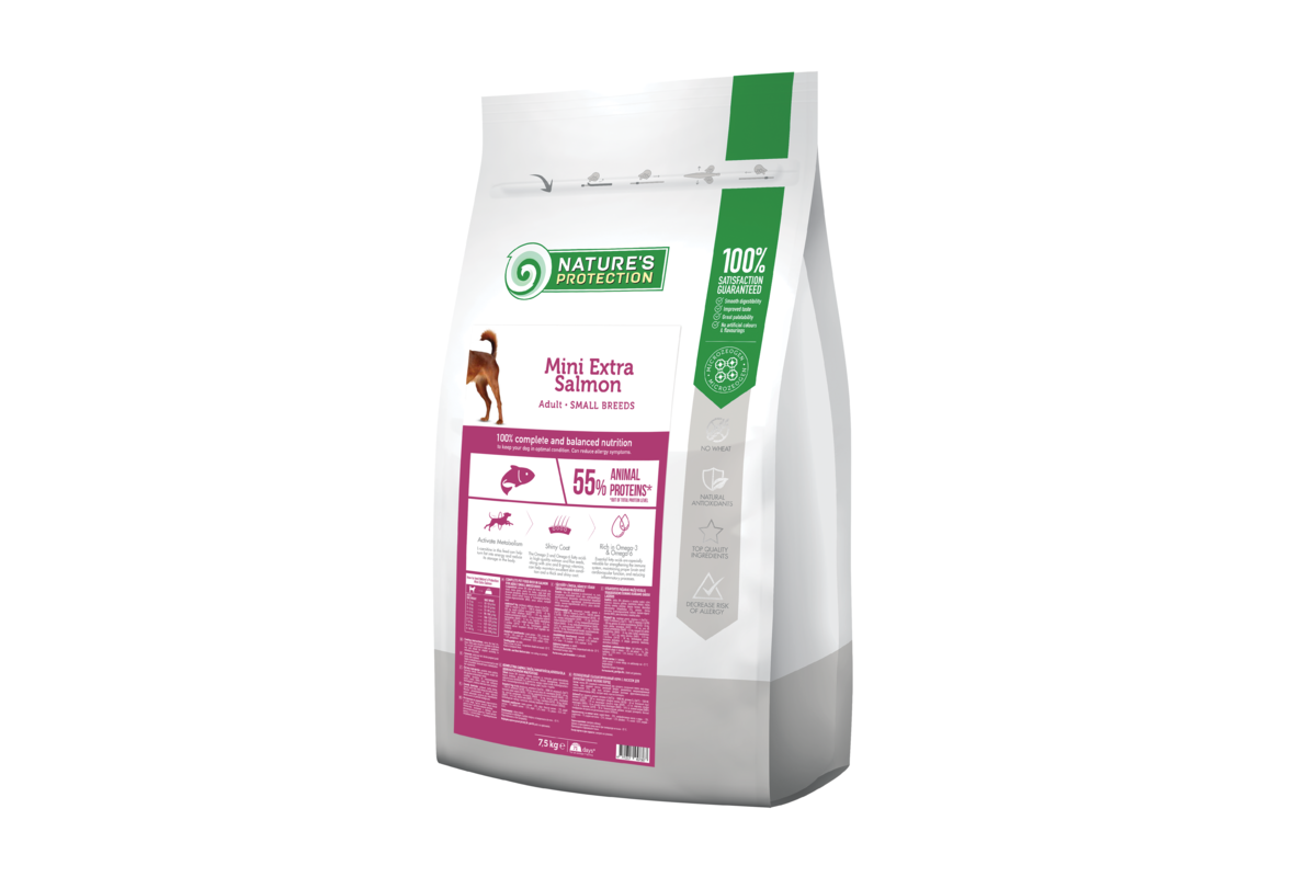 Aukščiausios klasės visavertis sausas pašaras su lašiša suaugusiems mažų veislių šunims, sveriantiems nuo 1 iki 10 kg. Lašiša – tai alternatyvus baltymų šaltinis. Maistine verte lašiša yra viena vertingiausių žuvų ir pasižymi mineralų gausa. Labai svarbu, kad NATURE‘S PROTECTION MINI EXTRA SALMON gaminamas ne iš skirtingų žuvų, pašarui naudojama būtent lašiša. Joje ypač gausu Omega-3 riebalų rūgščių, kurios itin naudingos mažų veislių šunų odai ir kailiui.