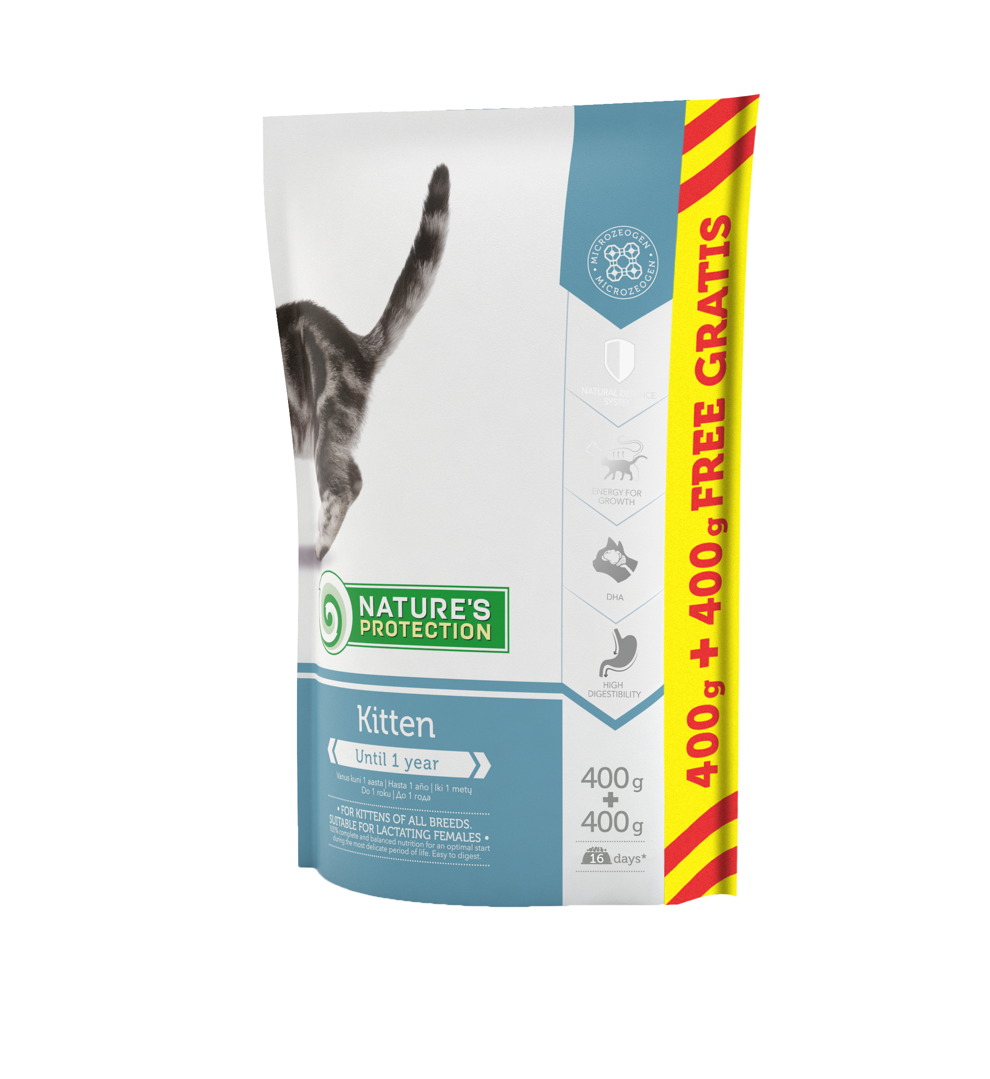 "Nature Protection"s Kitten Up To 1 Year" - visavertis kačiukų pašaras jauniems (iki 1 metų amžiaus) kačiukams. šis pašaras lengvai virškinamas, tad nujunkymas bus tolygus, o perėjimas prie suaugusio pašaro - paprastas. Jį galima duoti žindančiai katei.