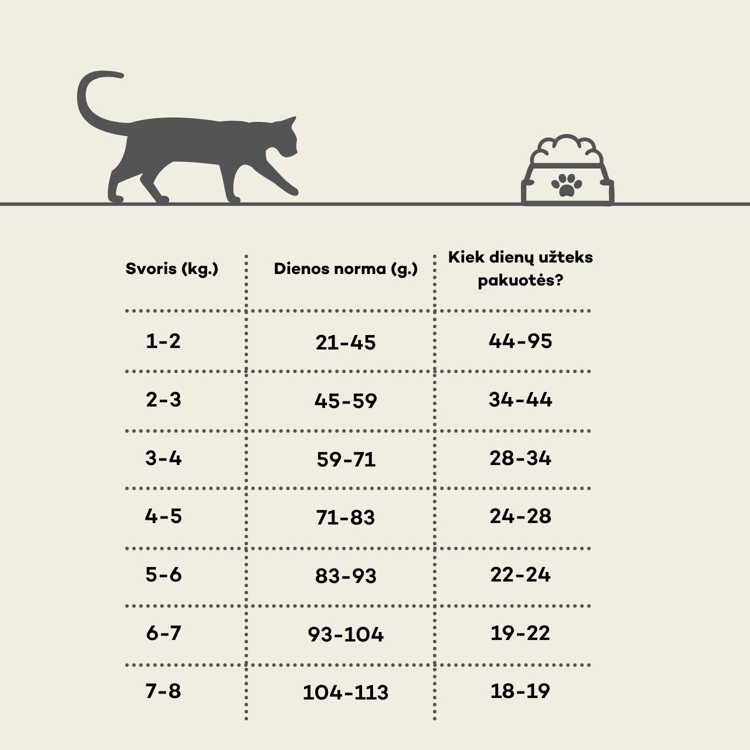 Šėrimo norma: žr. lentelėje. Lentelėje nurodytas tik rekomenduojamas pašaro kiekis. Kiekis turėtų būti keičiamas atsižvelgiant į atskirus kiekvienos katės poreikius.