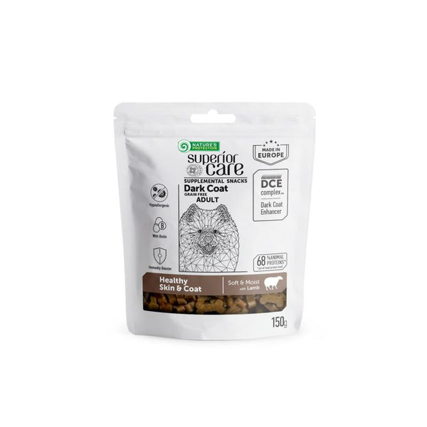 Nature's Protection Superior Care Dark Coat Grain-Free Healthy Skin & Coat – aukščiausios kokybės pašaro papildas, skanėstas sukurtas suaugusiems, tamsaus kailio visų veislių šunims. Praturtintas aukštos kokybės ėriena, jis padeda palaikyti sveiką ir žvilgantį kailį, taip pat užtikrina optimalią odos sveikatą.