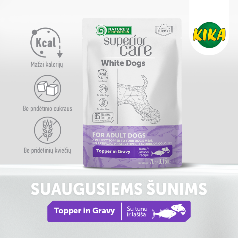 NATURE'S PROTECTION SUPERIOR CARE suaugusių, visų veislių baltakailių šunų pašaro papildas su tunu ir lašiša padaže yra specialiai sukurtas suaugusiems šunims, turintiems jautrią virškinimo sistemą.