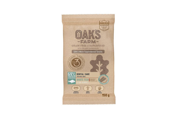 Oak's Farm Suaugusių šunų begrūdis skanėstas su balta žuvimi dantų priežiūrai