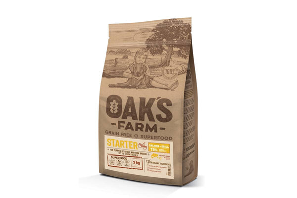 Oak's Farm Mažų ir labai mažų veislių sausas begrūdis pašaras su lašiša ir kriliu šuniukams iki 4 mėn. ir žindančioms kalėms