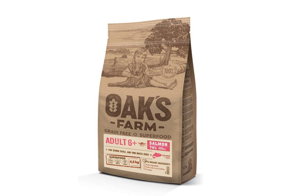 Oak's Farm Vyresnių nei 6 metų mažų ir labai mažų veislių šunų sausas begrūdis pašaras su lašiša