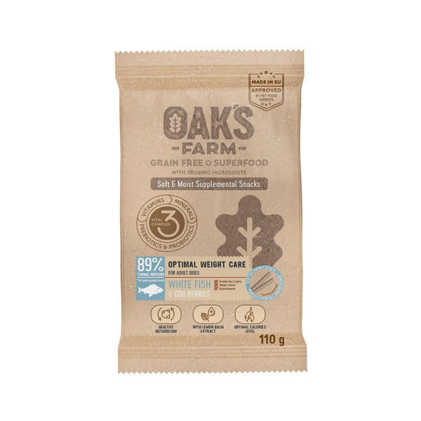 OAK’S FARM Optimal Weight Care su balta žuvimi – tai daugiau nei skanėstas. Jis sukurtas padėti išlaikyti šuns optimalų kūno svorį ir kartu rūpintis sąnariais bei virškinimu.