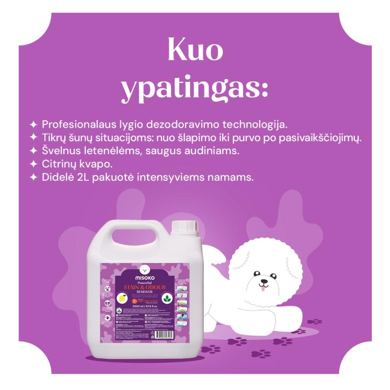 MISOKO šunų kvapo ir dėmių šalinimo purškiklis – citrinų kvapo, 2000 ml, yra sukurtas intensyviam naudojimui šeimoms su keliais augintiniais, veislynams, groomingui ar gyvūnų viešbučiams. Tai tas pats efektyvus produktas kaip ir 750 ml versija, tačiau didesnė talpa užtikrina ekonomišką ir ilgalaikį naudojimą.