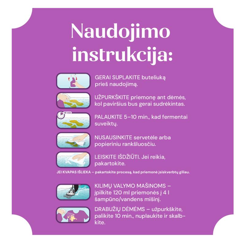 Biologiškai neutralizuoja kvapus ir dėmes.