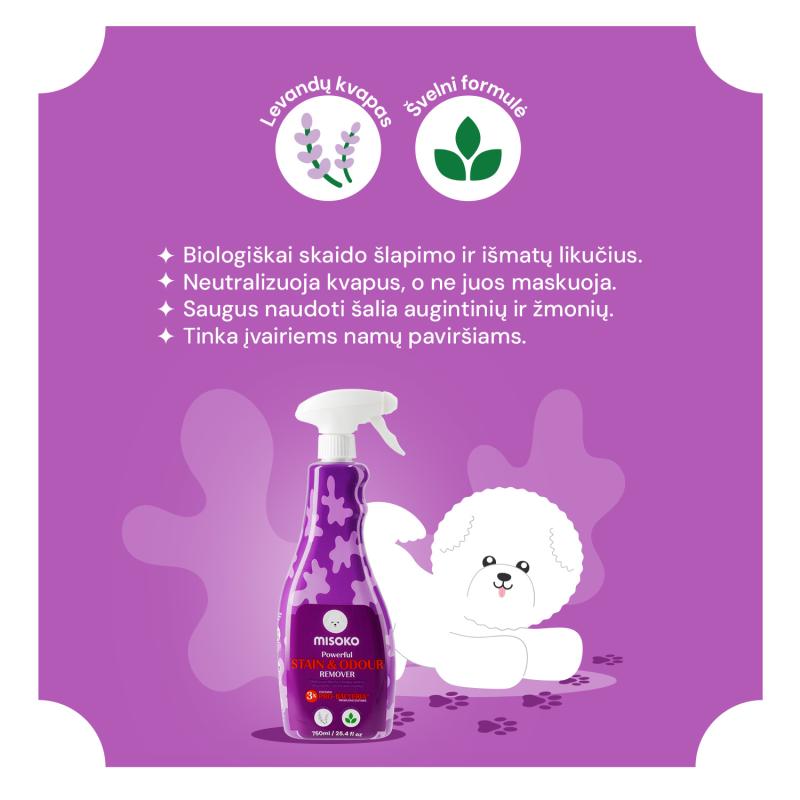 MISOKO purškiklis su PRO-BACTERIA™ formule biologiškai neutralizuoja šunų kvapus ir dėmes. Saugus vaikams bei augintiniams, tinkamas kasdieniam naudojimui namuose.