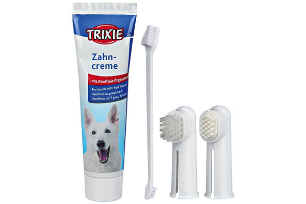Dantų priežiūros rinkinys – dantų pasta, dviejų galų šepetėlis ir du antpirščiai.
