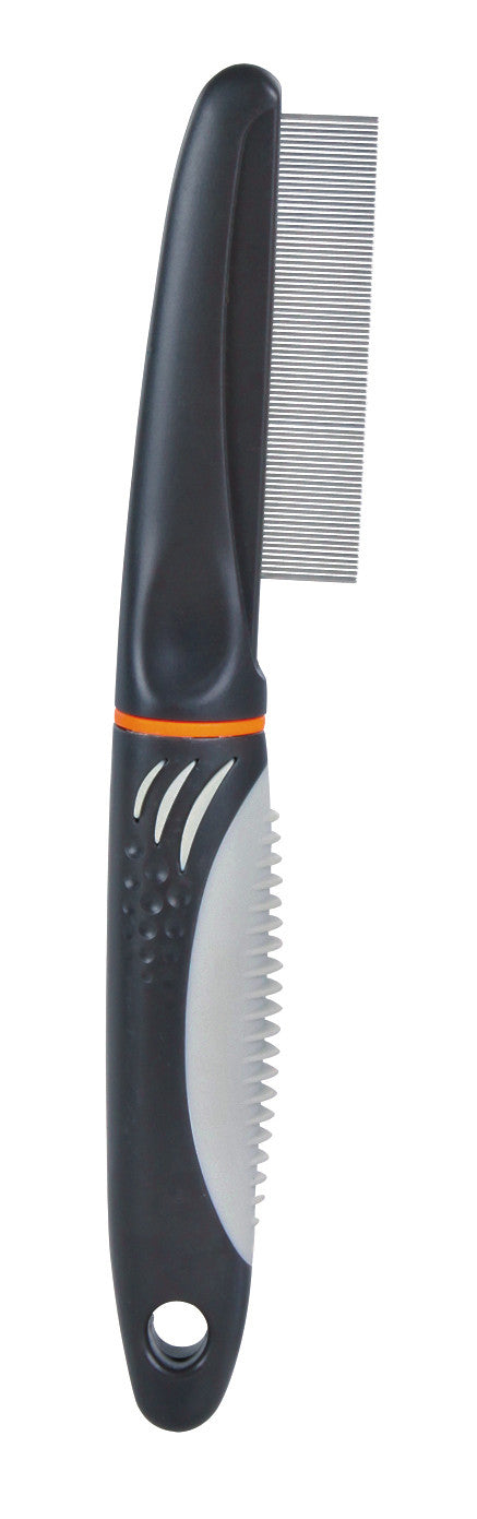 Šunų ir kačių šukos užapvalintais dantukais, plastmasine rankena skirtos parazitams iššukuoti.