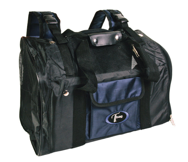Juodos-mėlynos spalvų kuprinė gyvūnui nešti.