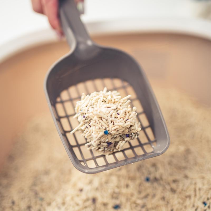 - Kačių kraiko kastuvėliu nukaskite išmatas su grumsteliais ir nuleiskite juos tualete.